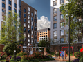 Двор комплекса расположен на уровне первого этажа и выполнен как уютное закрытое пространство для жизни. Здесь находятся зоны отдыха с современными беседками и скамейками, детская площадка для детей разных возрастов и спортивная зона для активных занятий. Закрытая и охраняемая территория обеспечивает безопасность и спокойствие для жителей.