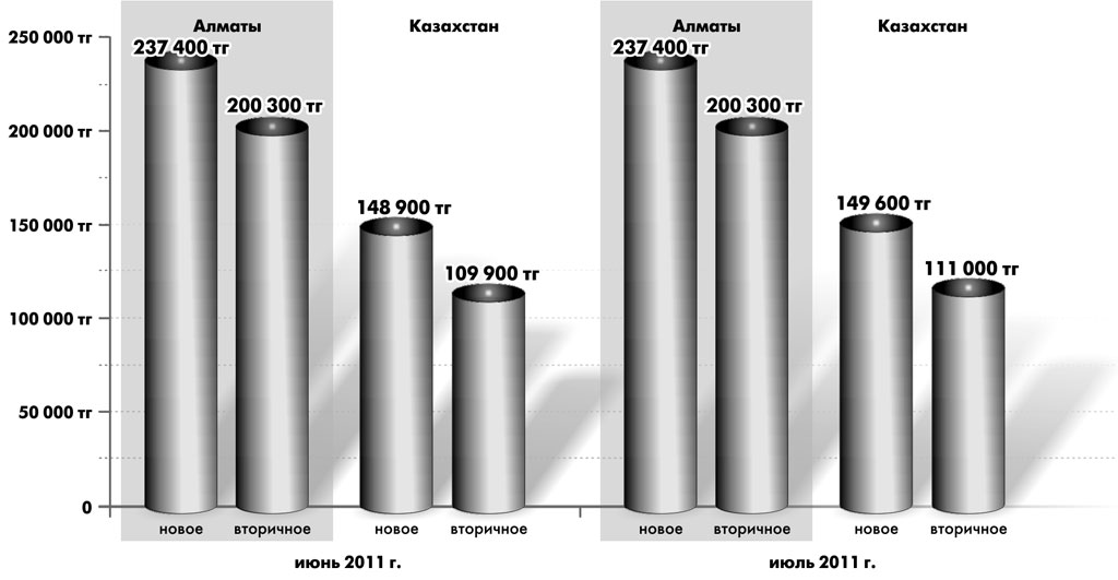 В Алматы средняя цена 1 кв. м в новостройках и на вторичном рынке осталась на уровне июня — 237 400 и 200 300 тенге соответственно.