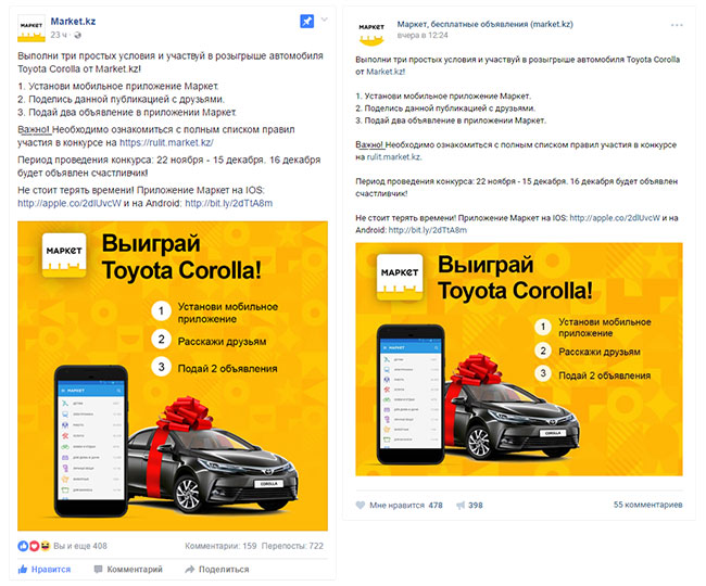 Важно! Поделиться в социальных сетях нужно именно закреплённой публикацией на страницах Маркет в Facebook или ВКонтакте. Выглядит пост вот так: