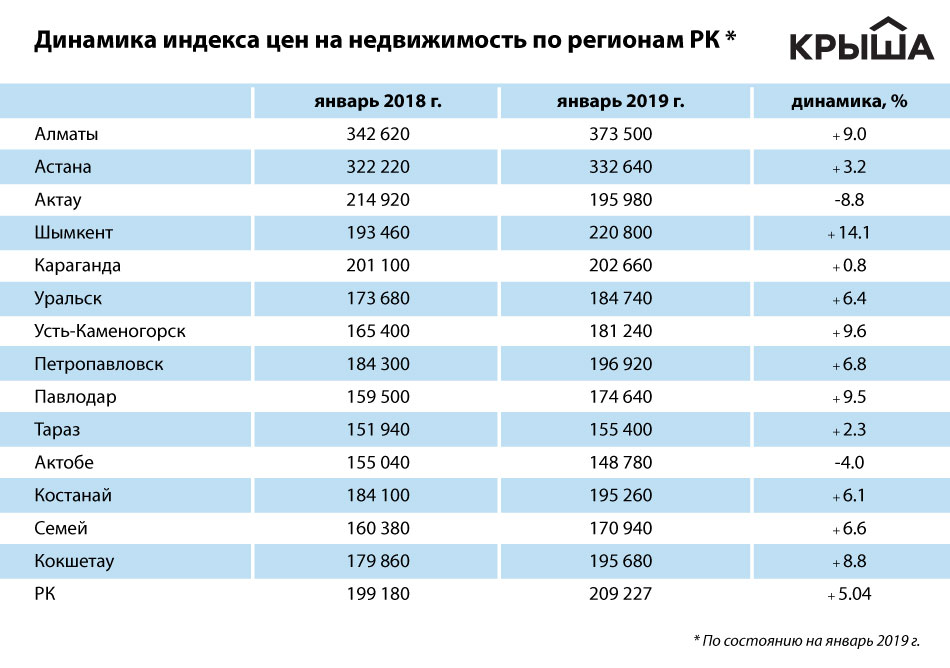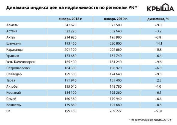 Для рынка жилья 2019 год начался с роста средних цен предложений. Положительная динамика в январе наблюдалась в 13 регионах (из 14 исследуемых Krisha.kz). В большинстве из них показатели оказались рекордным за последние 2-3 года.