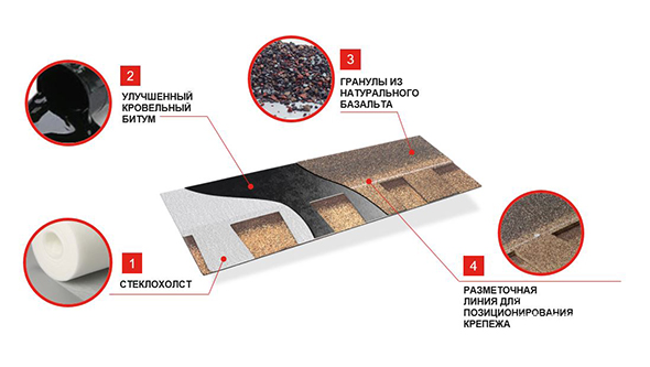 Основа гибкой черепицы SHINGLAS — сверхпрочный стеклохолст — эластичный материал, который не гниет. Следующим важным компонентом гибкой черепицы является улучшенный кровельный битум. Благодаря инновационным разработкам его свойства превосходят обычный битум. Например, теплостойкость улучшенного битума составляет 100–110 °С. Поэтому гибкая черепица подходит для эксплуатации даже в жарком климате.