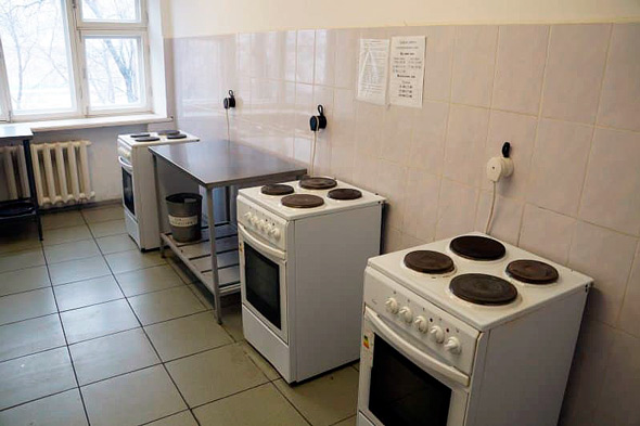 На общей кухне обычно стоят 2–4 газовые плиты. Пользоваться ими можно свободно. Условия — уборка кухни и мытьё плит по графику.