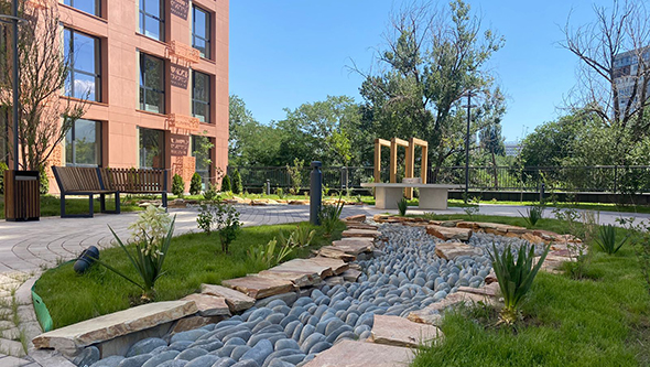 Также застройщиком разработан ландшафтный дизайн проекта. На территории двора выполнена сухая имитация речки камнями, в составе которых присутствует золото. Златолит был специально отобран и привезен из Челябинска, а вот