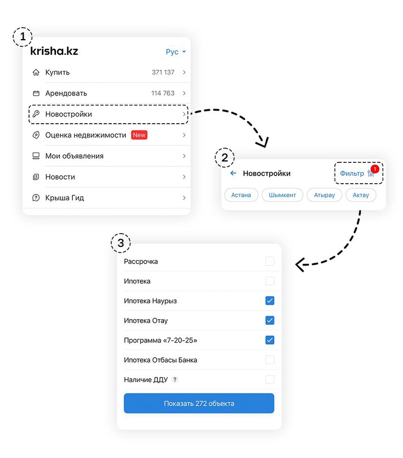 Ознакомиться с доступными объектами: посмотреть цены, планировки и т. д. — можно также на Krisha.kz, в разделе «Новостройки»