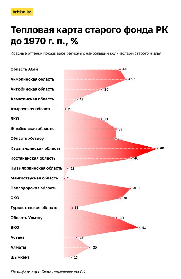 Самый старый жилой фонд — в Карагандинской области, где почти 60 % зданий были построены до 1970 года.