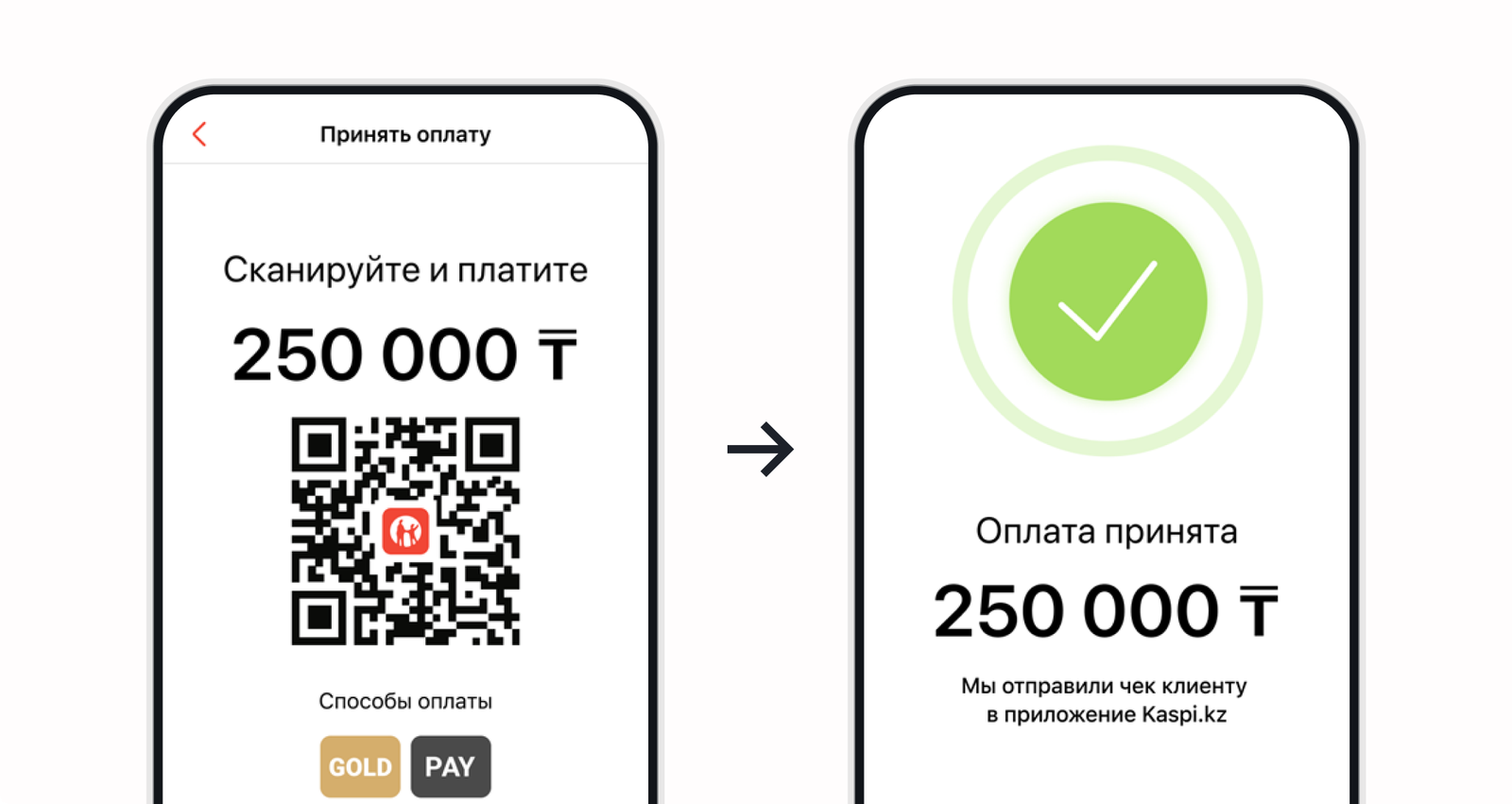 После оплаты сервис автоматически формирует электронные чеки и отправляет их клиентам в приложении Kaspi.kz или Kaspi Pay, а также в налоговую.