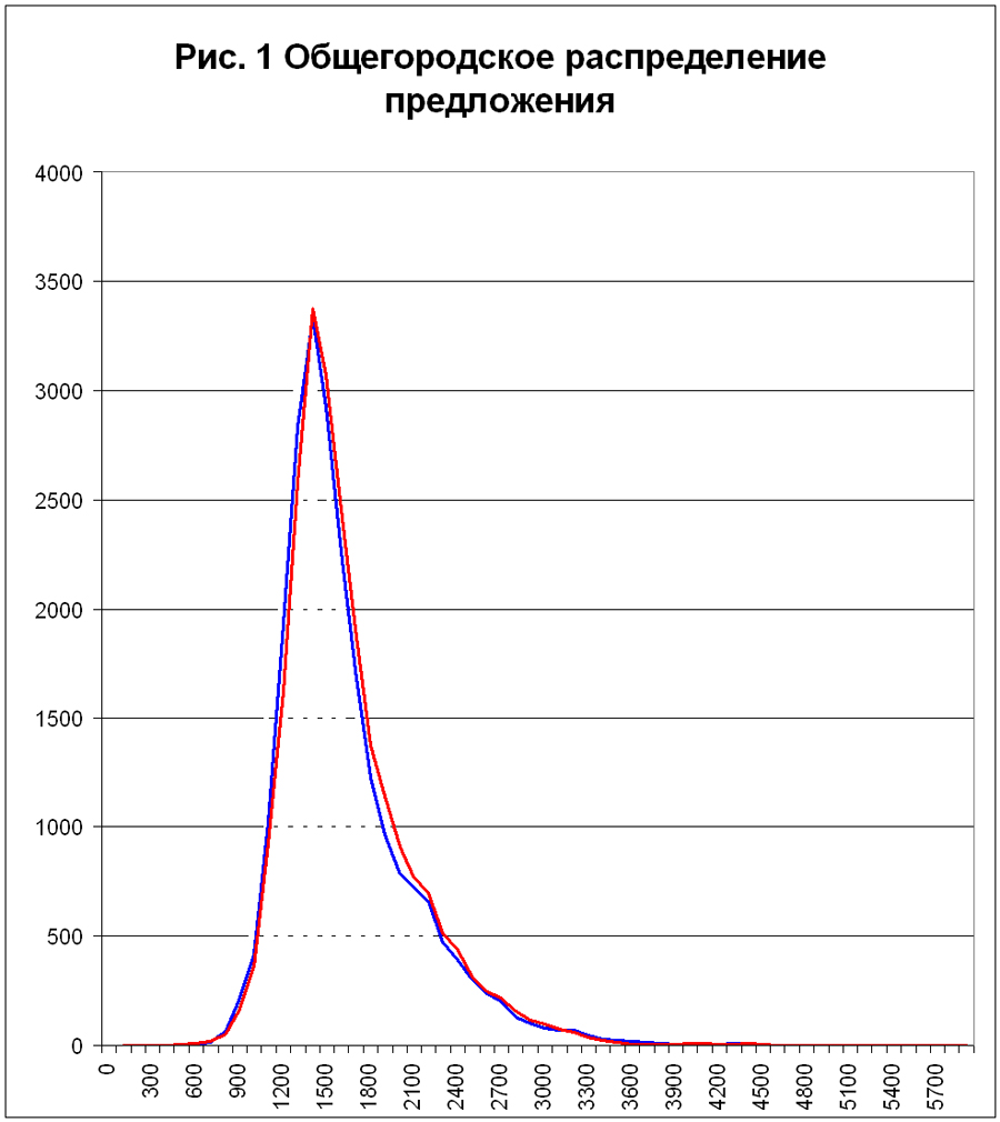 На Рис. 1 показаны распределения общегородского предложения для мая и июня, а на Рис.2 — разность этих распределений, то есть изменение структуры предложения.