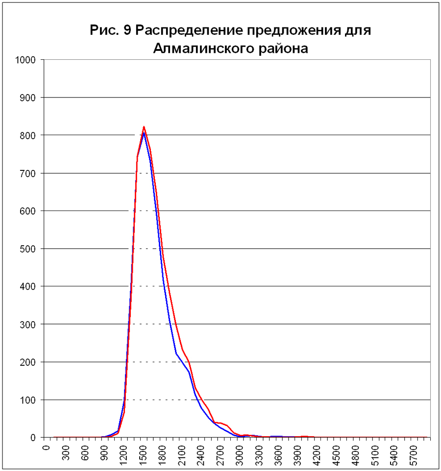 На Рис. 9 показаны распределения предложения в Алмалинском районе для мая и июня, а на Рис.10 — разность этих распределений, то есть изменение структуры предложения