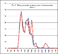 рис. 3 видно, что в области средних индексов произошли заметные изменения: в области 2200$..3200$ предложение стало меньше, а для индексов 3200$…3800$ распределение сместилось вправо. Для индексов 3800$...4500$ сегодня предложение несколько меньше, чем на прошлой неделе. Объем кластера 5000$…5600$ вырос примерно в три раза.