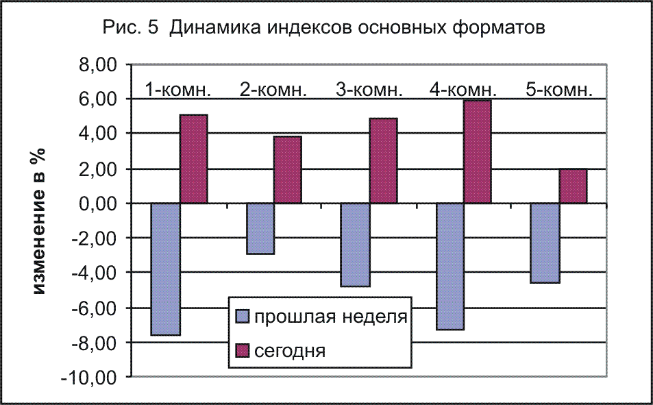 Изменение индексов по форматам: На Рис. 5 показаны темпы изменения индексов для различных форматов на этой и прошлой неделях (изменение в % за неделю). Отметим сегодняшнюю почти полную инверсию темпов изменения индексов по отношению к прошлой неделе для всех форматов. Все тренды за неделю поменялись с отрицательных значений на положительные. Отметим также, что для всех форматов (кроме 5-комнатных - малая статистика) темп роста индекса примерно одинаков и находится в пределах +3.87%...5.96%.