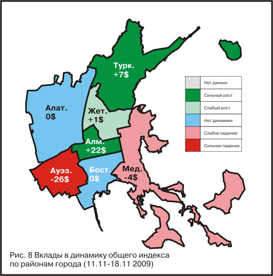— основная конкуренция вкладов сегментов в динамику среднего по городу индекса шла между Алмалинским (+22$) и Ауэзовским (-26$) районами;
