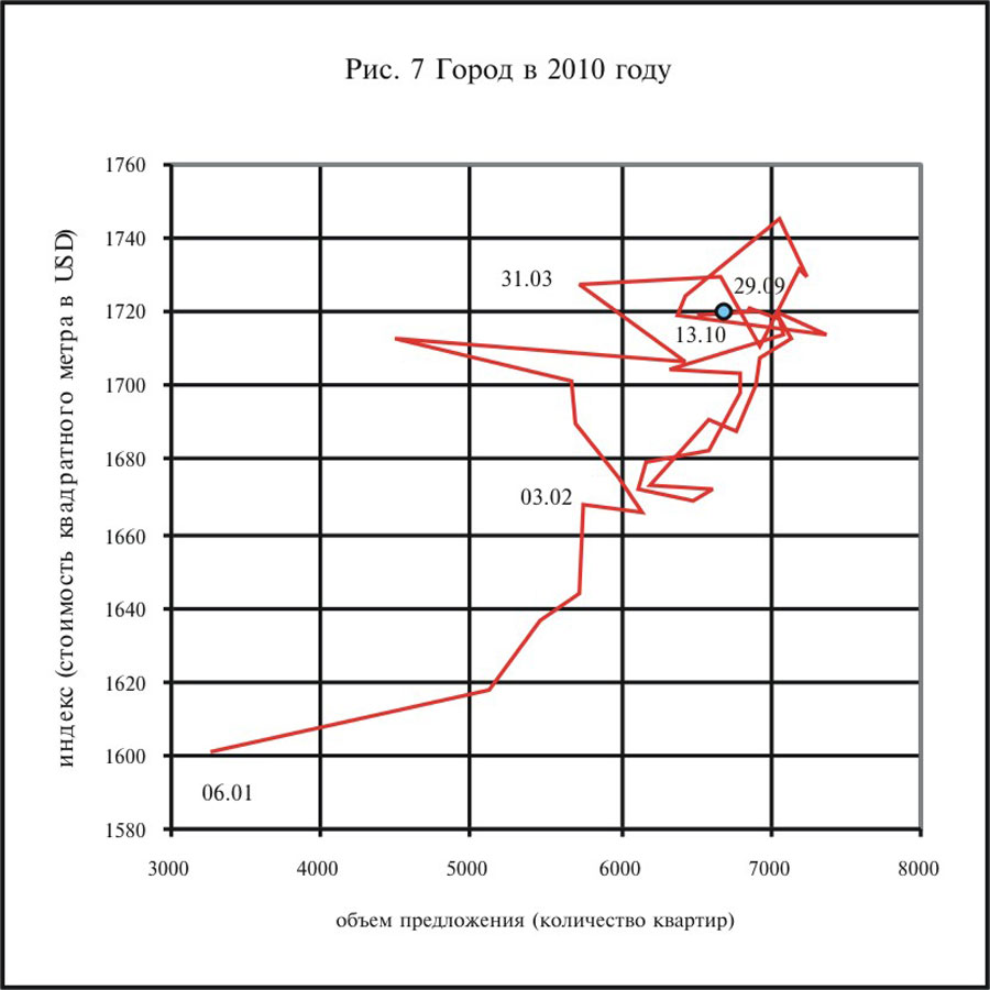 Линия на рис. 7, постепенно удлиняясь с каждой неделей, наглядно показывает совокупное изменение во времени основных рыночных параметров города.