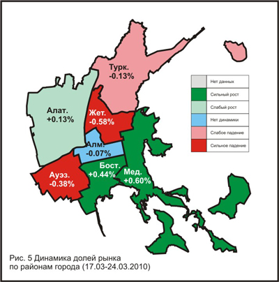 — два самых дорогих района города (Медеуский и Бостандыкский) показали значительное увеличение своих долей рынка (+0.6% и +0.44% соответственно);