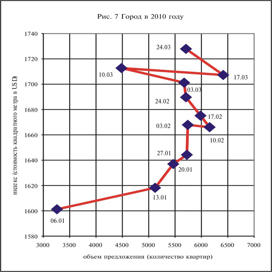 Линия на Рис. 7, постепенно удлиняясь с каждой неделей, наглядно показывает совокупное изменение во времени основных рыночных параметров города.