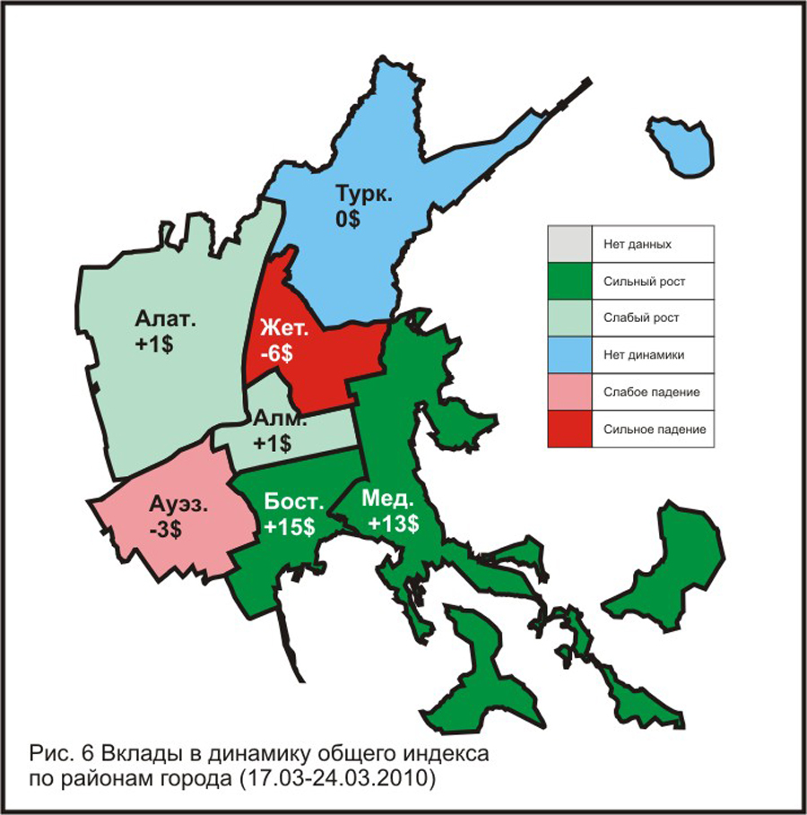 — Медеуский и Бостандыкский районы дали основные положительные вклады в динамику среднего по городу индекса (суммарно +28$);