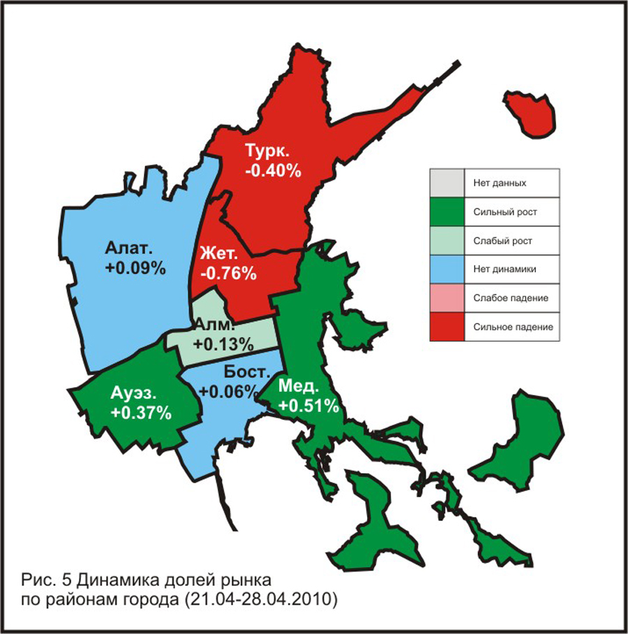 — заметно увеличили свои доли рынка три района: Алмалинский (+0.13%), Ауэзовский (+0.375) и Медеуский (+0.51%);