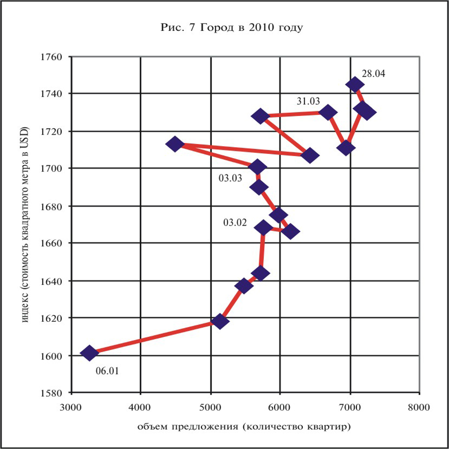 Линия на Рис. 7, постепенно удлиняясь с каждой неделей, наглядно показывает совокупное изменение во времени основных рыночных параметров города.