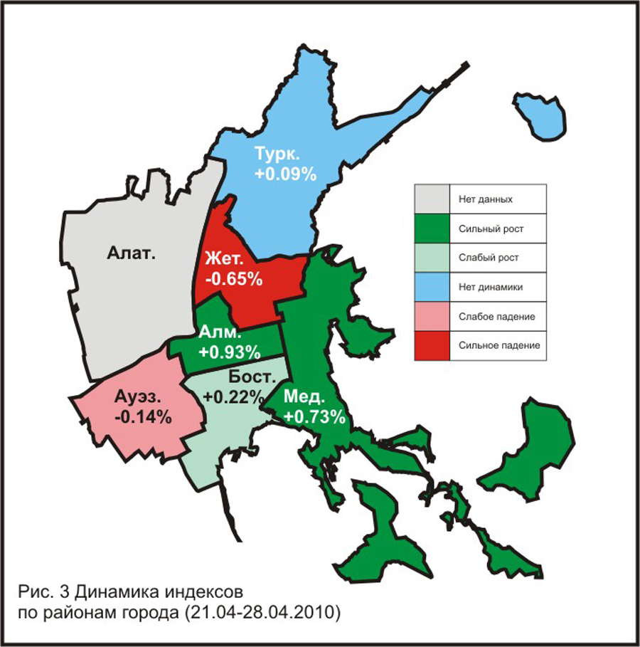 — в двух районах произошло заметное увеличение индексов: Алмалинский (+0.93%) и Медеуский (+0.73%).
