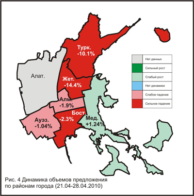 — два района показали сильное уменьшение объемов предложения: Турксибский (-10.14%) и, особенно, Жетысуский (-14.44%);