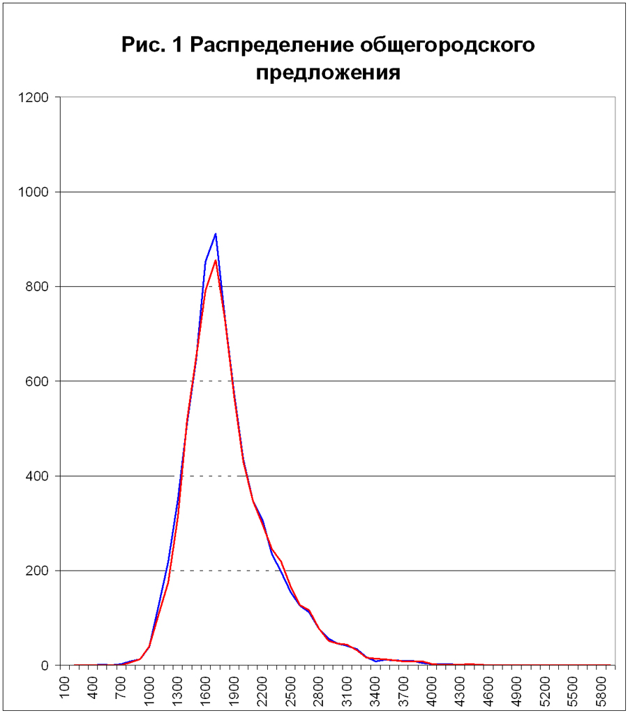 — характер кривой изменения предложения (Рис. 2) говорит о том, что за неделю произошел отток относительно дешевого жилья и сдвиг рынка в сторону удорожания;