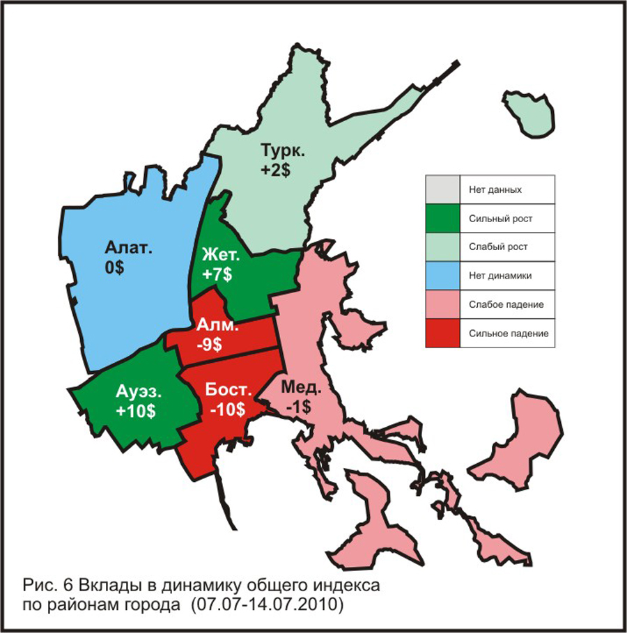 — основная конкуренция вкладов в динамику среднего по городу индекса была между Ауэзовским и Жетысуским районами (суммарно +17$) с одной стороны, и Алмалинским и Бостандыкским районами (суммарно −19$) с другой стороны;