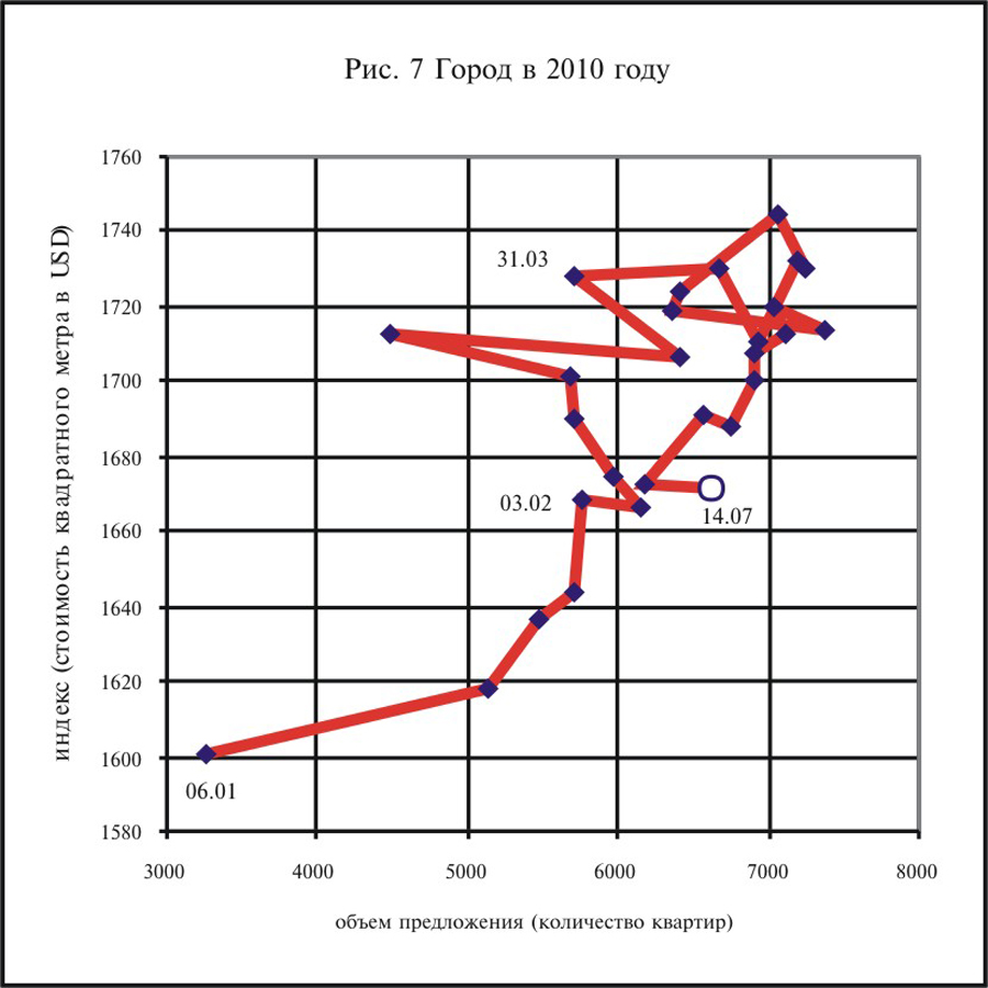 Линия на Рис. 7, постепенно удлиняясь с каждой неделей, наглядно показывает совокупное изменение во времени основных рыночных параметров города.