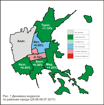 — наибольшие темпы роста индекса среди всех рассматриваемых сегментов рынка наблюдаются в Турксибском (+1.14%) и Медеуском (+1.03%) районах;