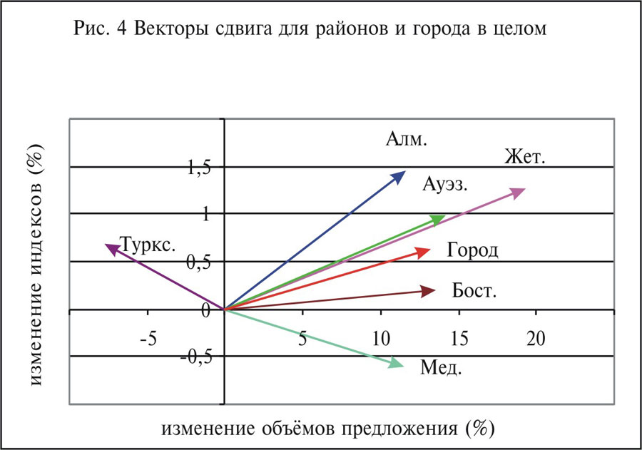 — вторая группа районов движется в направлении «влево-вверх» (рост индекса при падении объёма предложения);