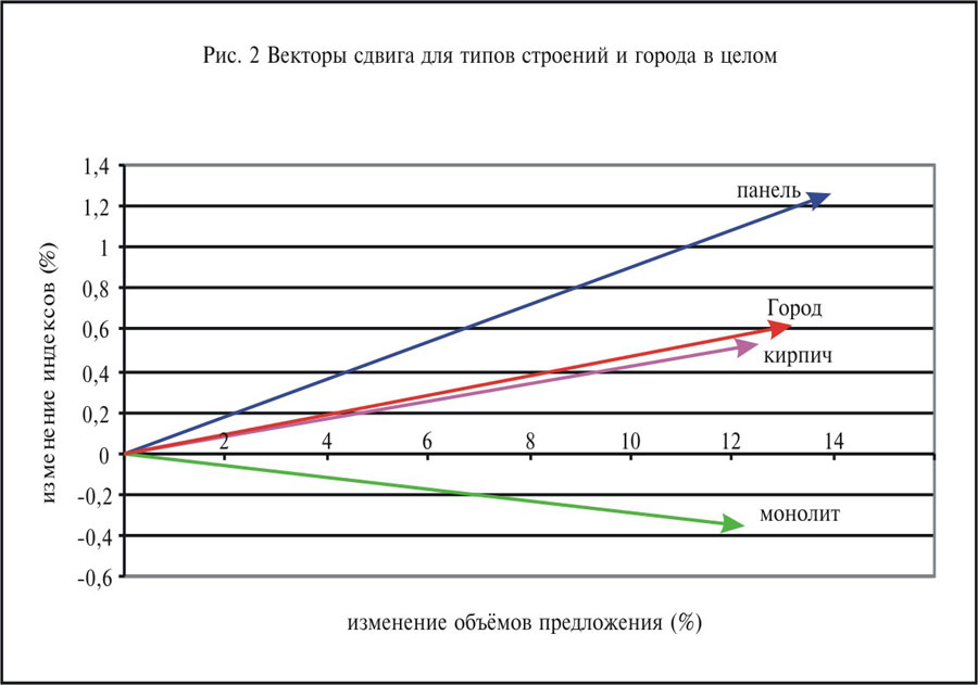 — результирующее направление вектора смещения города («вправо-верх») сформировалось под воздействием популярных типов (панели и монолита).