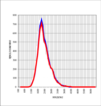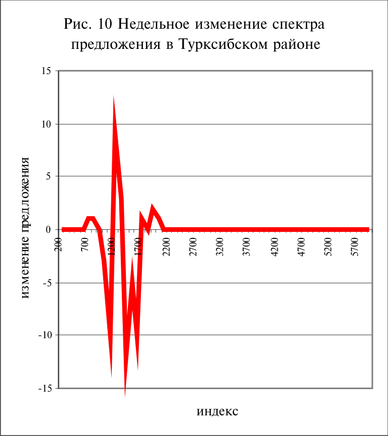 На рис. 3 показаны спектры предложения в Жетысуском районе для прошлой (синяя линия) и этой недели (красная линия). На рис. 4 показано изменение спектра предложения в Жетысуском районе за прошедшую неделю.