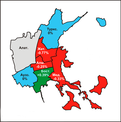 — основное перераспределение объёмов предложения по районам: огромное снижение доли объёма предложения Бостандыкского районов в пользу Алмалинского, Жетысуского и Ауэзовского районов;