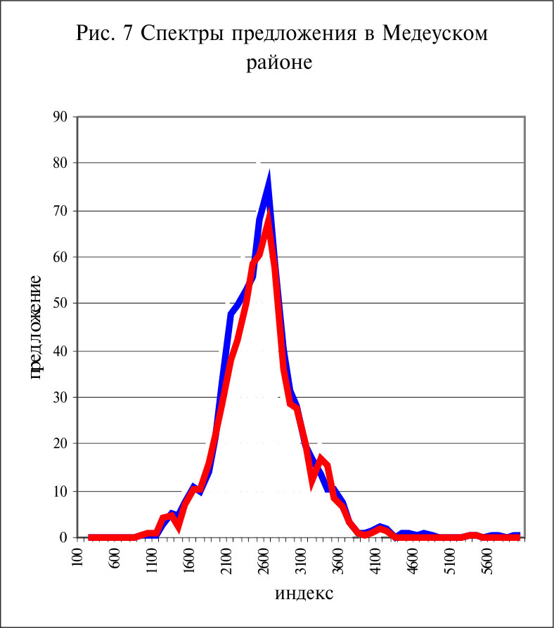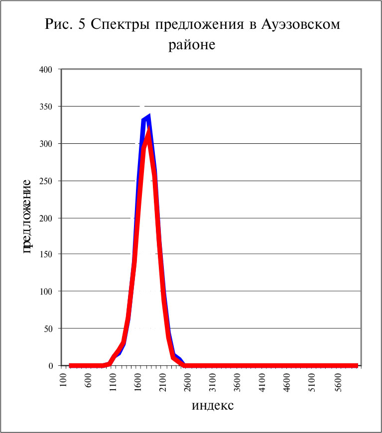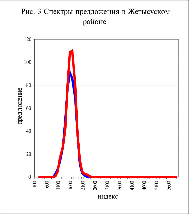 На рис. 3 показаны спектры предложения в Жетысуском районе для прошлой (синяя линия) и этой недели (красная линия).