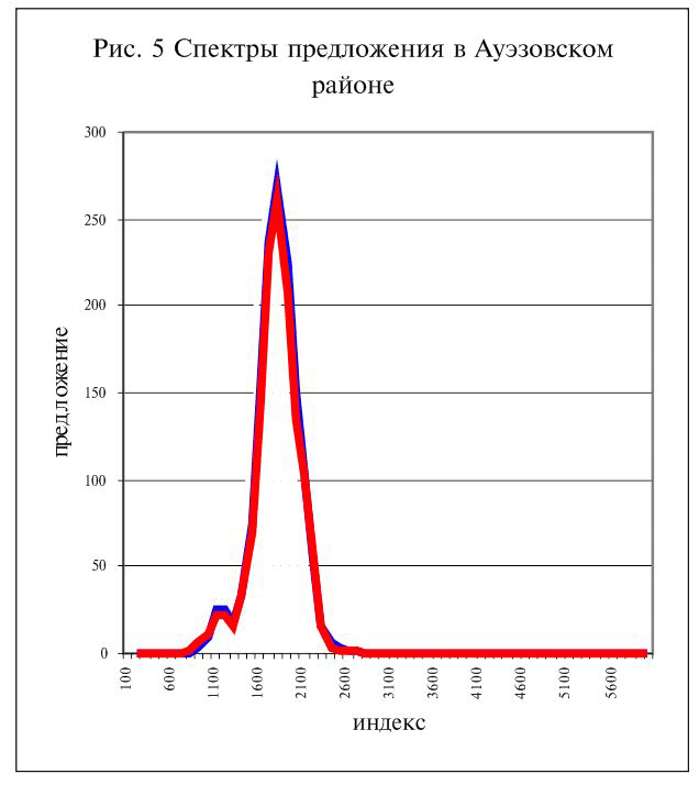 На рис. 5 показаны спектры предложения в Ауэзовском районе для прошлой (синяя линия) и этой недели (красная линия).