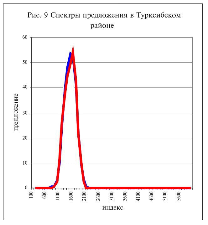 На рис. 3 показаны спектры предложения в Жетысуском районе для прошлой (синяя линия) и этой недели (красная линия).