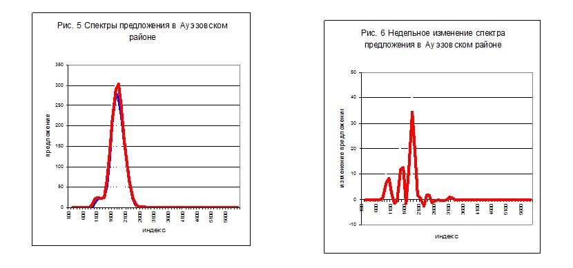 На рис. 5 показаны спектры предложения в Ауэзовском районе для прошлой (синяя линия) и этой недели (красная линия).