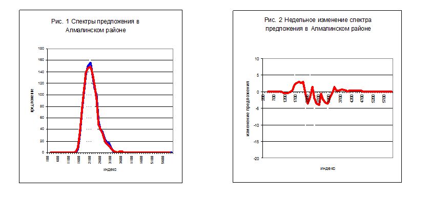 На рис. 1 показаны спектры предложения в Алмалинском районе для прошлой (синяя линия) и этой недели (красная линия).