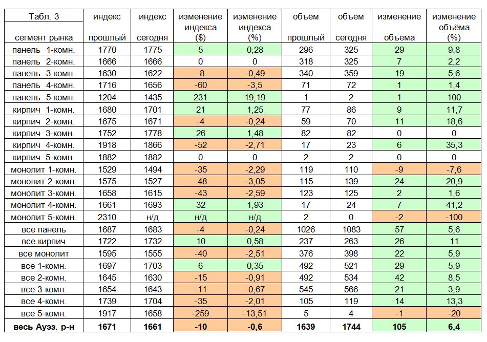 В таблице 9 приведены общегородские данные по индексу дешевого жилья, индексу дорогого жилья, индексу расслоения и динамике этих параметров за неделю.