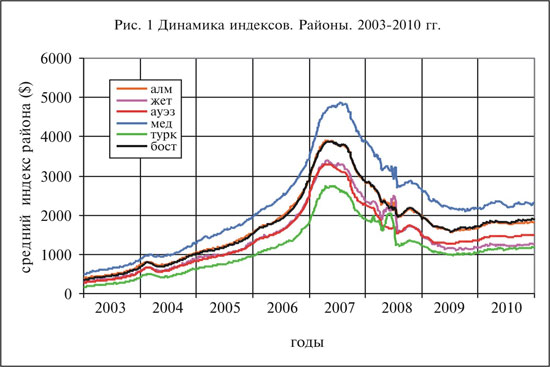 2003-2010 гг.: надувание «пузыря» в2006-2007 и сдувание его в 2007-2009 годах; - кривые изменения индексов Бостандыкского и Алмалинского районов очень близки во всём периоде рассмотрения;