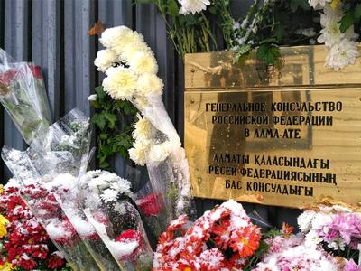 Первые цветы у ограды российского посольства в Астане и консульства в Алматы появились ещё в воскресенье, в день национального траура России. В храмах сегодня служат панихиду по погибшим.