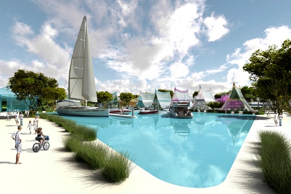 Вокруг перевёрнутой восьмёрки архитекторы предложили построить небольшую торговую деревню с ресторанами и магазинами. Все эти здания должны представлять собой современную интерпретацию традиционных корейских домов ханок, заявляют представители бюро Planning Korea.