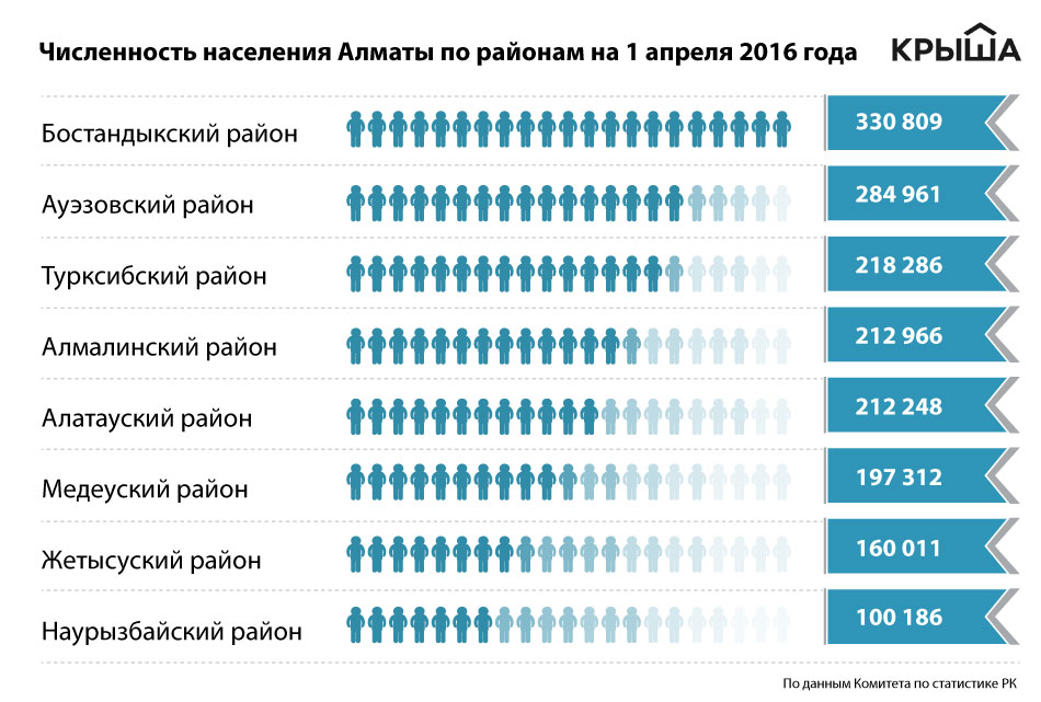 В Алматы за три месяца количество граждан увеличилось в Наурызбайском (+2.31 %), Алатауском (+ 1.98 %) и Медеуском (+ 0.8 %) районах. При этом самым многочисленным является Бостандыкский (330 809 тыс. человек).