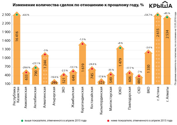 Лидерами по наибольшему количеству заключённых сделок являются Астана (2 615 сделок), Алматы (2 534) и Карагандинская область (1 619). Аутсайдеры — Атырауская (299 сделок), Кызылординская (323) и, несмотря на апрельский рост, Северо-Казахстанская области (480).