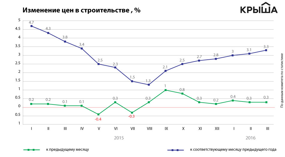 Цены в строительной отрасли Казахстана демонстрируют небольшой растущий тренд. Так, по информации Комитета по статистике РК, в марте 2016-го по сравнению с февралём цены в сегменте строительства увеличились на 0.3 %.