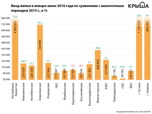 Увеличение объёмов ввода жилплощади наблюдается в четырнадцати регионах республики. Наибольший рост по сравнению с январём-июнем 2015 года отмечен в Акмолинской (+68.9 %), Павлодарской (+66.1 %) и Южно-Казахстанской (+55 %) областях. В Астане за это же время возведено более 1.1 млн кв. м жилья. Это на 20.5 % выше прошлогодних показателей.