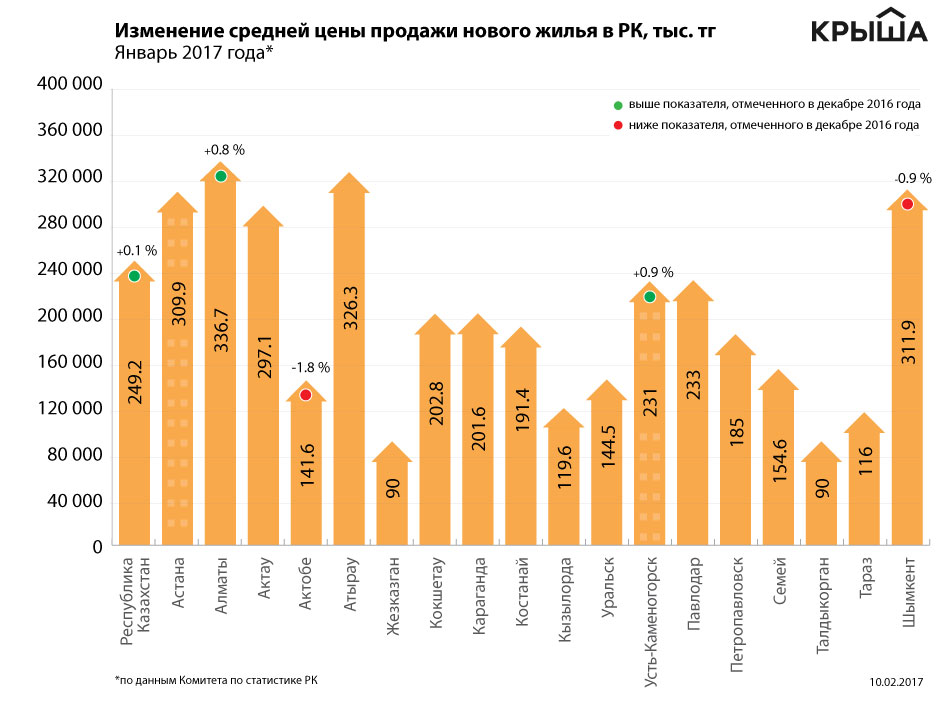На вторичном рынке, наоборот, средняя цена продажи снизилась на 0.1 % по сравнению с последним месяцем 2016-го и составила 188.4 тыс. тенге за 1 кв. м.
