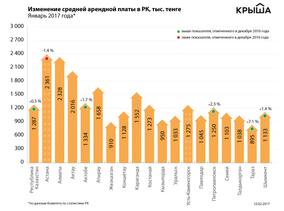 В ряде городов РК выросли арендные ставки. В январе, по данным Комитета по статистике, они увеличились на 0.5 %, достигнув 1 278 тенге за 1 кв. м.