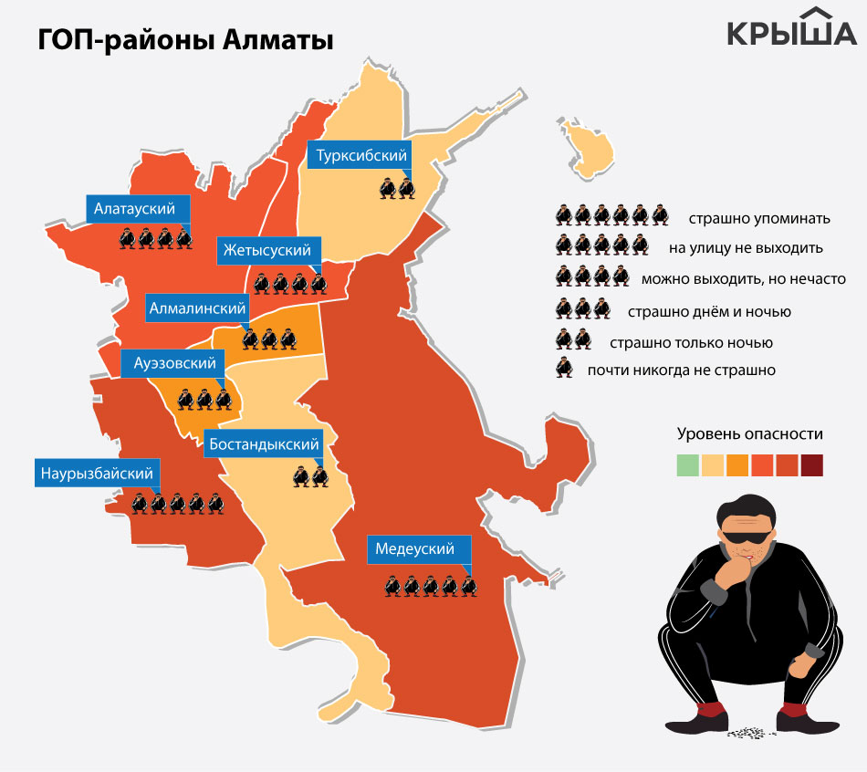 «Крыша» решила поддержать популярный в Сети флешмоб и создала карту гоп-районов Алматы для приезжих. При её составлении были использованы данные карты уголовных правонарушений за семь месяцев.