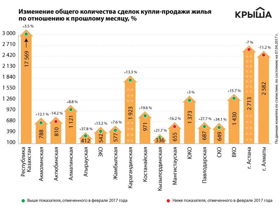 В марте казахстанцы продавали и покупали жильё 17 569 раз, что на 3.5 % больше, чем в феврале. Так, согласно данным Комитета по статистике РК, увеличение активности на рынке наблюдалось в 12 регионах страны.