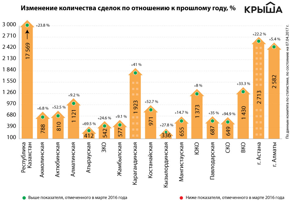 В целом в марте текущего года по сравнению с аналогичным периодом прошлого количество сделок увеличилось на 23.8 %. Наибольшее увеличение отмечено в СКО (+94.9 %), Атырауской (+69.5 %) и Костанайской (+52.7 %) областях. Годовой прирост в Астане и Алматы составил 22.2 и 5.4 % соответственно.