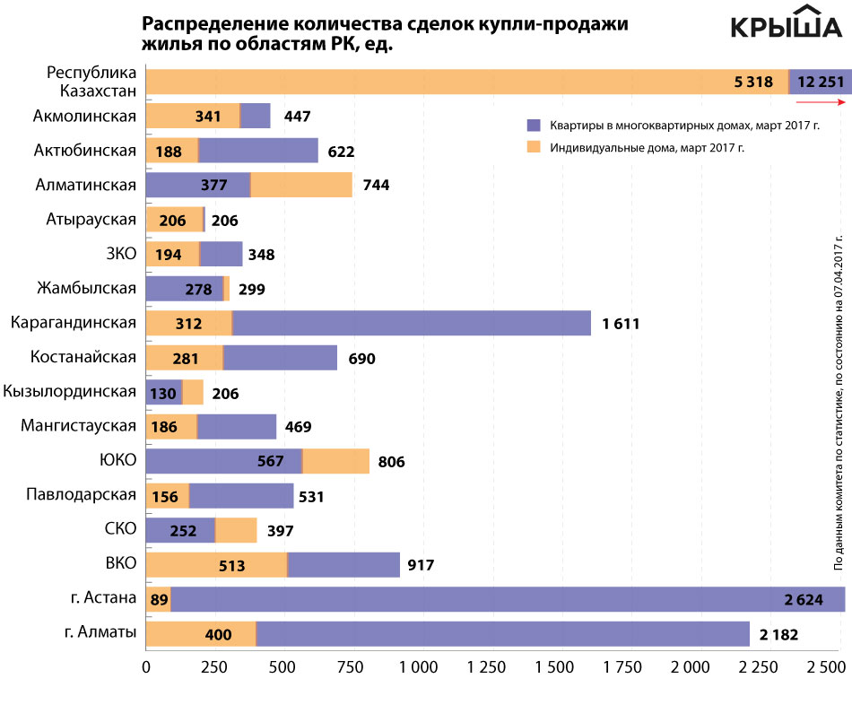 Максимальный объём сделок купли-продажи в прошлом месяце пришёлся на Астану (2 713), Алматы (2 582) и ВКО (1 430), минимальный — на Кызылординскую (336), Атыраускую (412) и Западно-Казахстанскую (542) области.